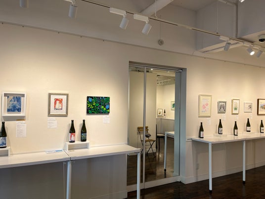 作品と、ラベルになった酒瓶を会場で展示し、作品販売の他、お気に入りのラベルを貼ったお酒も購入できる。(購入は一ノ蔵 直営店ECサイトより)