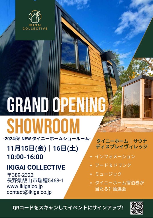 このたび、カナディアンサウナの長野県販売店であるIKIGAI COLLECTIVEがグランドオープニングイベントを開催いたします。当社は自然豊かな長野県飯山市に拠点を構え、持続可能なライフスタイルを提供するタイニーホームの製造・販売会社として「タイニーホーム・サウナディスプレイヴィレッジ」を設立しました。近年、アウトドアやサウナに関する関心が高まる中、特に屋外サウナの人気が急上昇しています。この流れを受け、高品質なタイニーホームとサウナを体験できる専門ショールームをオープンする運びとなりました。地域の魅力を最大限に引き出し、ご来場される皆様に癒しとリラックスの機会をご提供することを目指しております。多くの方のご来場を心よりお待ちしております。