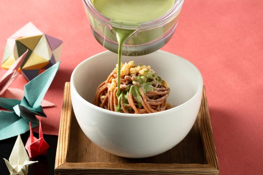 抹茶ラテソースをかけて楽しむモンブラン