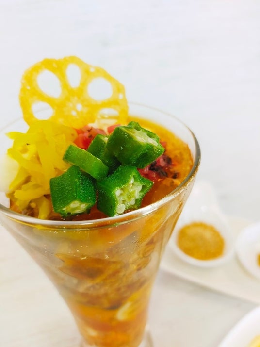 ベースのあんかけにさらに追加していくのは、五霞町に工場のあるキッコーマンの豆乳でまろやかに仕立てたスープに、ごまのコク、ラー油の辛味、ゆず胡椒の爽やかな香り、そして極めつけはカレー粉のスパイス感!見た目も香りも、味わいも噛む音まで五感を刺激します。