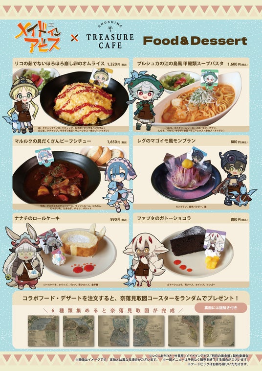 ENOSHIMA TREASURE CAFEでは従来のメニューにプラスして、『メイドインアビス 烈日の黄金郷』オリジナルコラボメニューをご提供いたします。