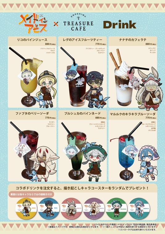 キャラクターをイメージしたコラボメニューやドリンクもございます。今回のコラボカフェの描き起こしキャラクターは、ENOSHIMA TREASURE CAFE名物のドラゴンとのコラボデザインとなっております。コラボメニューご注文特典のオリジナル謎付きコースター、『メイドインアビス 烈日の黄金郷』登場人物のオリジナルグッズもあわせてお楽しみください。