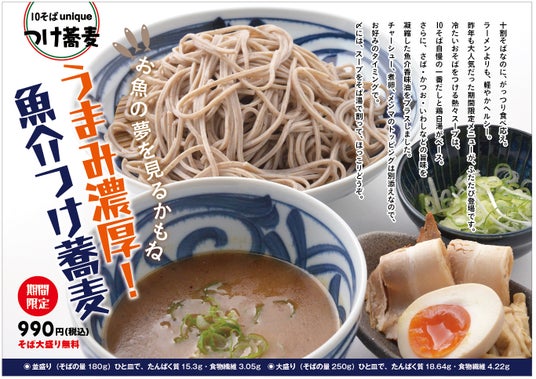 昨年の秋ごろに期間限定で販売していた「うまみ濃厚!魚介つけ蕎麦」がご好評につき、再登場。国産そば粉を使用した冷たい十割そばを、つけ麺のように熱いスープにつけてお召し上がりいただく当商品。昨年は4か月の販売期間で約1,200食販売したことから10そばuniqueシリーズの中でも人気を誇る一品です。特製のスープは、10そば自慢の一番だしと鶏白湯がベース。そこに、さば、かつお、いわしなどの魚粉を使用した魚介香味油をプラスすることで魚介のうまみをしっかりと感じていただけます。トッピングのチャーシューや煮卵、メンマは別添えなので、お好みのタイミングでお入れください。食べ終わった後はスープをセルフのそば湯で割って、〆までしっかりとお楽しみいただけます。