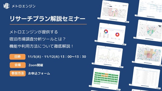 宿泊施設向けレベニューマネジメントツール『メトロエンジン』を提供し、宿泊業界のDX化や集客支援を行うメトロエンジン株式会社(本社:東京都品川区、代表取締役CEO:田中良介、以下メトロエンジン)は、2024年11月5日(火)と11月12日(火)の2日程でオンラインセミナーを開催します。本セミナーでは、宿泊市場分析ツール『メトロエンジン リサーチプラン』の機能や活用方法を中心に、新機能のご案内と事例を交えてご紹介いたします。