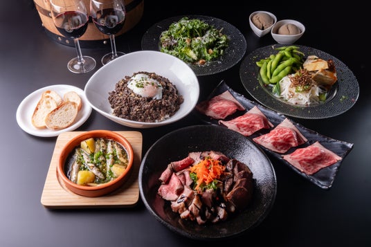 【和牛と樽ワイン バレル】では牛肉、ホルモンは全てA5ランクの黒毛和牛のみにこだわり、肉料理以外も全てがワインに合うように和、洋、中、様々の技法で調理しております。