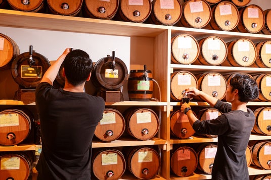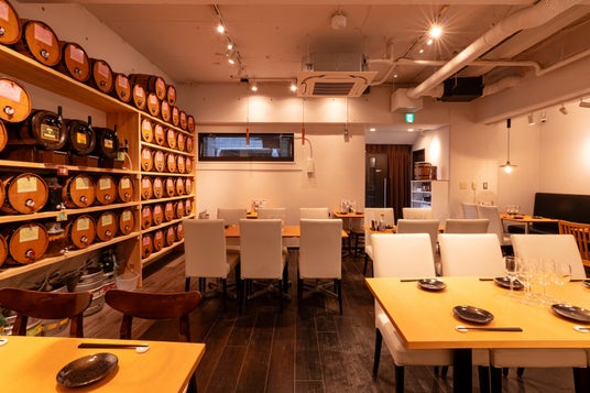 ワイナリーをイメージし、世界各国50種類の樽ワイン、ビール、レモンサワー、ハイボール、スパークリングワインなどのサーバー類も全て樽の形で壁一面に並べており雰囲気抜群。