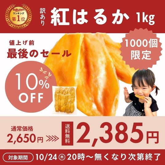 創業からわずか2年で、ネット通販で1日1万件以上の注文を記録し、楽天市場で総合ランキング1位を獲得した「芋國屋」。楽天お買い物マラソンの開始24日(木)20:00から『人気No.1 訳あり紅はるか干し芋 1kg』を10%OFFの価格にて販売いたします。こちらは1000個限定、無くなり次第終了です。※なお、割引商品には10%OFFクーポンはご利用いただけませんのでご注意ください。