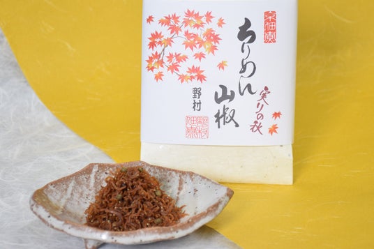 甘辛く炊いたちりめんと山椒の実のピリッとした辛みが絶妙な人気のちりめん山椒を、鮮やかな紅葉が描かれたパッケージでご用意しました。