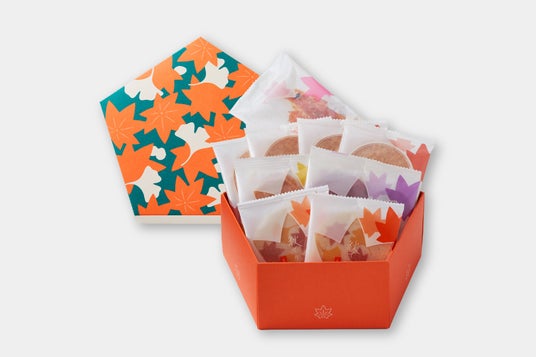 ゆかり4枚、香ばし赤えび1枚、もみじ2枚、焼き秋鮭1袋、紫おさつ1袋が入った秋だけの詰め合わせ。秋の装いを楽しんでいただけるパッケージです。