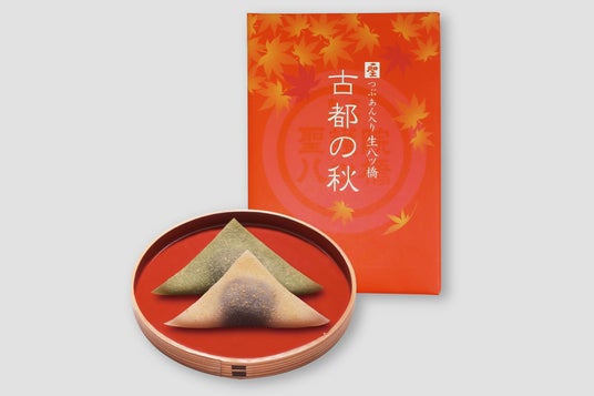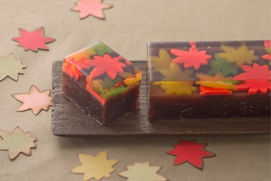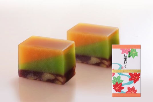 色鮮やかな紅葉をコハクと小倉羹の二層羊羹で。深紅や黄色や橙色。秋の陽を透かしてかえでの葉は色鮮やかに輝きます。少し渋めのお茶などともに嵐山、高尾、東山……京の紅葉の名所に思いを馳せて。