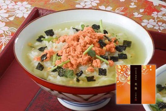 しっとりと脂ののった美味しい秋鮭を丁寧にほぐしてお茶漬けにしました。秋らしい限定パッケージでご用意。
