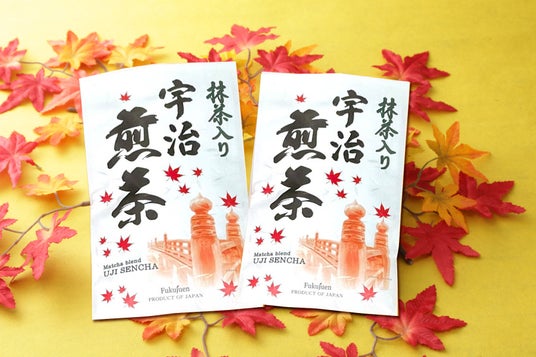 煎茶に抹茶をまぶした、香りのいいお茶。はなやかな紅葉のパッケージは、手みやげにもおすすめです。関西地区限定でのご用意。