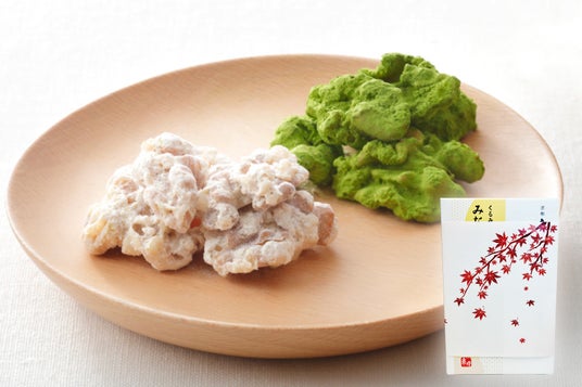 みな(皆)くるみ(集まって)食べていただきたいとの思いから誕生。上品な甘さの「和三盆くるみ」とほんのり苦味のある「抹茶くるみ」を紅葉のかけ紙で。