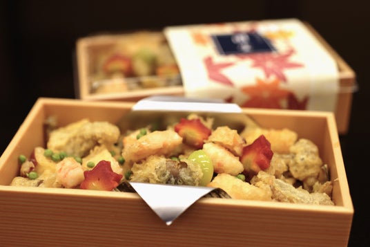 サーモンや銀杏、栗、さつまいも、丹波しめじ、舞茸など秋の味覚が満載の天ちらし。紅葉狩り、行楽のお供におすすめです。