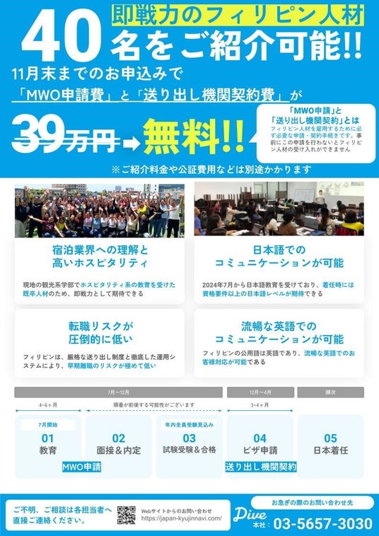 ダイブでは今年の8月からフィリピンの観光系学部卒業生40名を迎えて、日本語教育プログラムを開始しています(*3)。このプログラムは、6月に発表した4社提携(*4)に基づいて実施され、約5カ月間の日本語教育を経て、年内に特定技能「宿泊」分野の試験を受験する予定です。その後、試験に合格した外国人人材はダイブを通じて日本国内の宿泊施設で採用面接を受け、内定を得た場合は必要な手続きを経て2025年春頃の入国を目指します。
