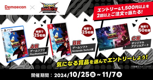 期間中にエントリー&1,500円以上(送料除く)を2回以上ご注文された方の中から抽選で合計100名様に「ソニック × シャドウ ジェネレーションズ」ゲームソフトやノベルティをプレゼントいたします。