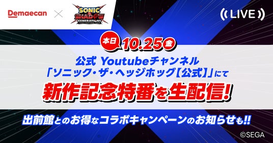 公式YouTubeチャンネル「ソニック・ザ・ヘッジホッグ【公式】」にて、コラボ配信を実施いたします。みなさんもぜひ、出前館で美味しいお食事を楽しみしながらご視聴ください!
