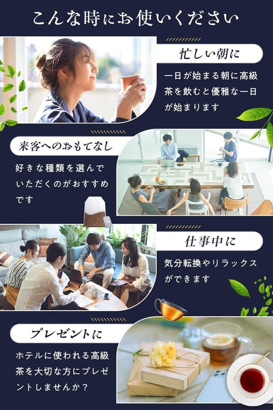 忙しい朝の一杯、来客中のおもてなし、仕事中のリラックスに、プレゼントにおすすめです。またいろんな紅茶を楽しみたい方にも好評です