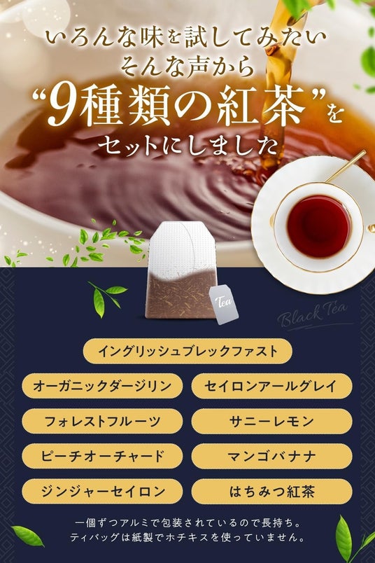 人気の9種類の紅茶をお買い得なセットにして販売しています。紅茶は一個ずつアルミで包装されているので長持ち。ティバッグは紙製です。