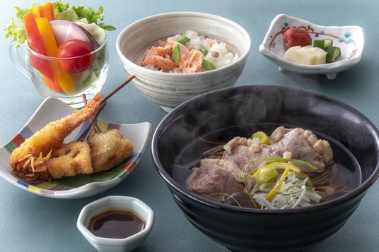 加賀蓮根など串あげに 滋味豊かな鴨の治部煮そば