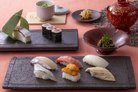 握り、押し、細巻の多彩な寿司が味わえるランチ。握りは、とろ、雲丹、針烏賊、煮穴子のほか近海の白身などネタ自慢の6 貫がラインナップ。石川県では地元で獲れる魚を使って作るハレの日の伝統食「笹寿司」は〆鯖で、細巻は定番の鉄火巻をご提供。茶碗蒸しやデザートも付いた充実のコースをご堪能ください。