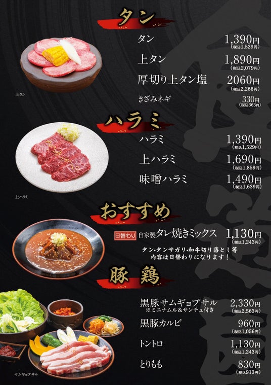 単品・・・・タン・ハラミ・おすすめ・豚・鶏 その他ホルモン、肉刺し、一品料理、ご飯物、麺、スープ・・・各種取り揃えております。