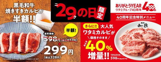 ワタミ株式会社(本社:東京都大田区、以下ワタミ)が全国で展開する、高品質な焼肉をリーズナブルな価格で提供する「焼肉の和民」では、毎月恒例の「ニクの日」企画として2024年10月29日(火)も1日限定で、脂の旨味と引き締まった赤身の絶妙なバランスをとろ~りたまごに付けてお楽しみいただく「黒毛和牛焼きすきカルビ」を通常価格1皿598円(税込657円)の半額となる1皿299円(税込328円)での販売、さらにワタミ創業40周年記念の特別メニューは第1弾でも好評だった牛1頭から数%しか取れない希少部位プレートフィンガーの大人気「ワタミカルビ」をおよそ40%増量して提供いたします。ダブルでお得なこの機会にぜひお立ち寄りください。