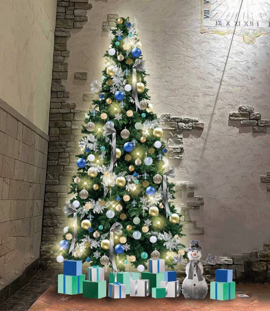 ロビーには、高さ4.5mの巨大ツリーを設置し、雪がきらめくイメージで、ブルーや白、シルバーやゴールドの色合いをベースに、雪の結晶や各種オーナメントを散りばめました。