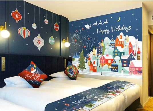 きらめく雪が舞い降りる聖夜の街をテーマに2種類のデザインで展開するコンセプトルームは、壁面やテーブル、ベッドスローやクッション、洗面室内など、お部屋の随所にクリスマス装飾をちりばめてお出迎えします。また客室内にツリーも設置し、クリスマスらしい空間を演出します。