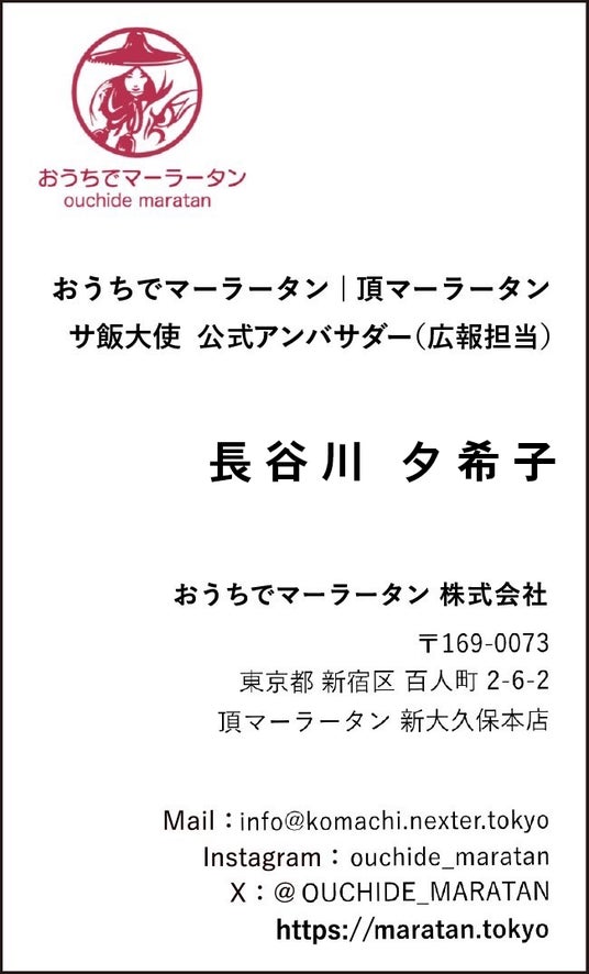 SNSマーケティング事業を行う ネクスター株式会社(本社:東京都 新宿区、代表取締役社長CEO:細田悠巨)のグループ会社である、D2Cブランド事業を行う おうちでマーラータン 株式会社(本社:東京都 新宿区、共同代表 齋藤悠)が運営するD2Cブランド『おうちでマーラータン』( https://maratan.tokyo )は、新大久保に本店を構える『 頂マーラータン 新大久保 本店 』の味をおうちで簡単に味わえるようにした冷凍麻辣湯のヘルシーD2Cブランドです。その公式アンバサダー(広報担当)として、長谷川 夕希子が就任し、ネクスター・オフィシャル・パートナーシップ契約を締結しましたことをこちらにお知らせいたします。
