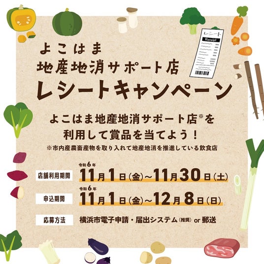 横浜市では市内産農畜産物を取り入れて地産地消を推進している飲食店を「よこはま地産地消サポート店」に認定しています。そこで、11月の地産地消月間にサポート店で利用したレシートで参加するキャンペーンを実施します。