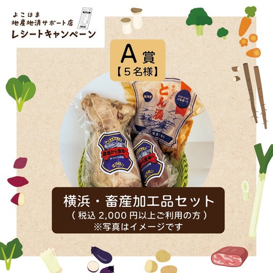 期間中に「よこはま地産地消サポート店」を利用したレシート等で応募し、当選者の皆様に賞品をプレゼントします。