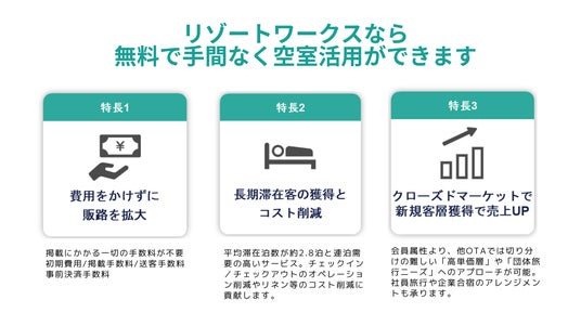 リゾートワークスは、掲載料無料・OTA手数料無料で、新規宿泊客を送客しています。