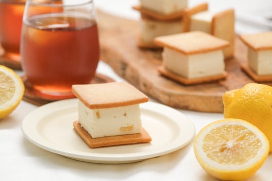 背徳感おやつ 極厚チーズケーキサンド レアチーズ~幸せずっしり。レアチーズの祝福~バター香る手のひらサイズのクッキーに、厚めのレアチーズケーキをサンドした、見た目も味も大満足の贅沢おやつです。
