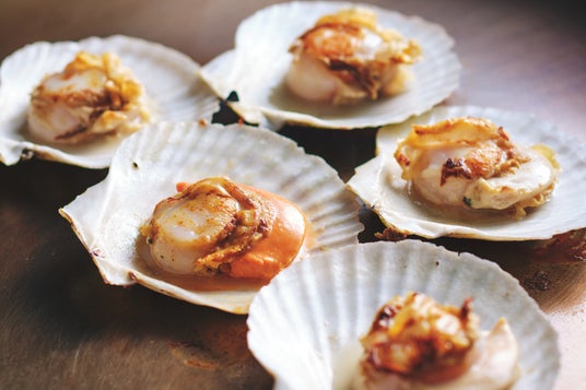 殻付き帆立貝の鉄板焼き カニクリームソース