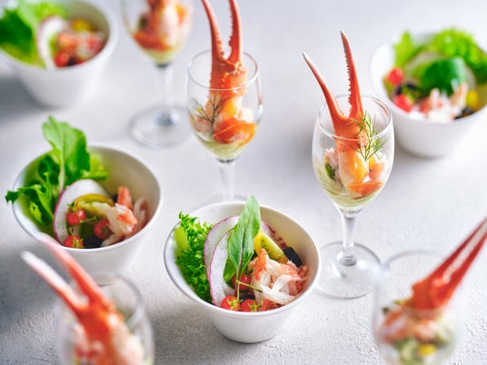 海鮮丼 / カニとアボカドのカクテル / カニの三色テリーヌ / カニ爪と有頭海老 ガーリックオイルソース / カニサラダ / カニと海老のちらし寿司 / 冷製茶碗蒸し カニあんかけ柚子の香り / マグロ 柚子醤油ドレッシング / 焼き茄子 和風玉ねぎソース / 長芋の炙り 西京味噌ソース / バナメイエビ シーザードレッシング / イカの和風玉ねぎドレッシング など