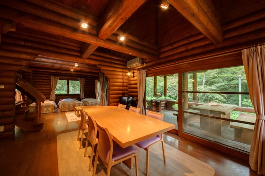 1LDKのログハウスには、ダイニング・キッチン・ソファ・テラスもあり、ご家族やご友人とのんびりお寛ぎ頂けます。シャワールーム・トイレ・洗面台もある清流高麗川沿いのログハウスです