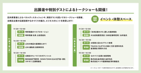 台東区と台東区産業フェア実行委員会が開催する「台東区産業フェア2024」のトークショータイムテーブルを公開しました。イベントはビジネス目的の方、消費者の方どなたでもご入場いただけます。入場無料のイベントですのでぜひお気軽にお越しください。事前登録は不要です。