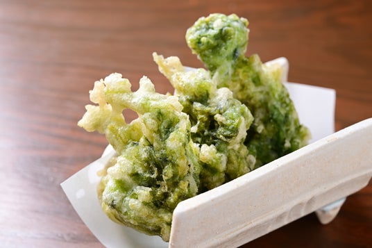 「あおさのりの天ぷら」川と海が混じり合う河口で育った青さのりは、磯の香りが強く、艶やかな緑色をしているのが特徴です。