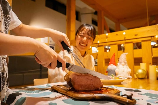 お客さまの目の前でスタッフがスライスして提供する「低温熟成丸ごとローストポーク 1,628円」や、雪が降り積もったようなたっぷりのチーズをスタッフが削り出して仕上げる「雪降るミートボールボロネーゼ 1,408円」、スイーツで北欧の冬景色を再現した「食べるスノードームパフェ 1,078円」など、ここでしか食べられない冬限定メニューをラインナップ。