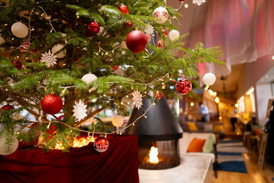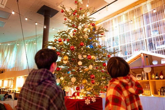 暖炉前のラウンジには巨大もみの木のクリスマスツリーが登場します。キラキラ光るイルミネーションや可愛いオーナメントがツリーを彩ります。