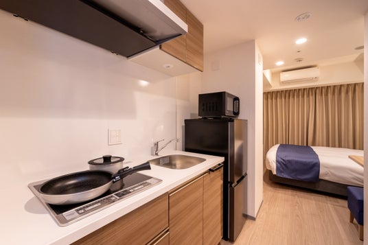 今回客室としてリニューアルするのは、同ホテル内賃貸マンションフロアの11階から13階にある計12室で、客室タイプはセミダブルルーム(ベッド幅1,200mm:3室)とダブルルーム(ベッド幅1,600mm:9室)の2タイプ。同ホテル内の高層階部分にあり、客室からは羽田方面の夜景がご覧いただけます。客室面積はいずれも約26平方メートル と同ホテル内の既存の客室より広めの設定で、室内には洗濯乾燥機やIHクッキングヒーター、電子レンジなどを設置し、中長期で滞在されるお客様にも快適に過ごしていただける仕様となっております。
