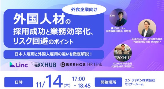 BEENOS株式会社(東証プライム:3328)の連結子会社で、特定技能雇用を包括支援するBEENOS HR Link株式会社(以下「BEENOS HR Link」)は株式会社Linc、株式会社DXHUBと合同で外食企業向けセミナー「外国人材の採用成功と業務効率化、リスク回避のポイント」を開催します。