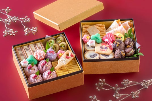 毎年好評の「スイーツおせち」は、二段重ねの重箱に、おめでたいとされる縁起物のひとつ「鯛」を模ったマカロンや、幅広い世代の方に人気のスイートポテトなどを詰め合わせた華やかなスイーツ重です。今回、おせちの定番「黒豆」を入れたロールケーキや平安時代から伝わる新春の縁起菓子「花びら餅」をモチーフにした紅白のオムレットなどを加え、内容を一部リニューアルしご用意します。新春気分を盛り上げる色とりどりのスイーツは、おせちの後のデザートとして、また、新年のご挨拶の手土産としてもおすすめです。