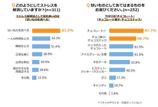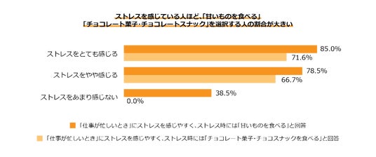 ストレスを感じている人ほど、「甘いものを食べる」「チョコレート菓子・チョコレート