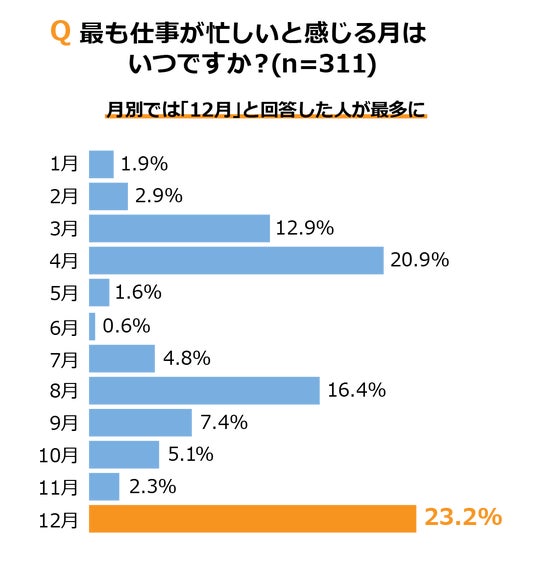 さらに、ストレスを感じやすいのは仕事が忙しいときと回答した人に仕事が最も忙しいと感じる月を聞いたところ、順に「12月(23.2%)」「4月(20.9%)」「8月(16.4%)」という結果になりました。12月は仕事の多忙が原因でストレスを感じやすい人が多い傾向にあるようです。