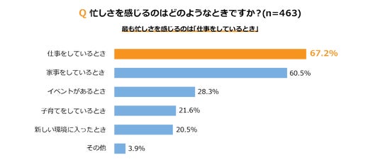 ストレスを感じやすいのは「忙しさを感じるとき」と回答した人に、どのようなときに忙しさを感じるか聞いたところ、「仕事をしているとき(67.2%)」にストレスを感じやすい人が多いことがわかりました。