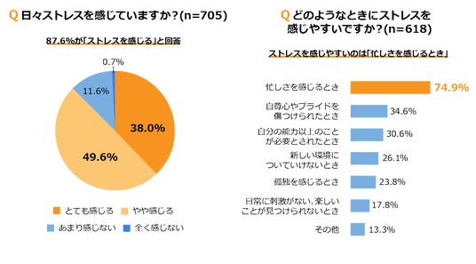 日頃ストレスを感じているか聞いたところ、「とても感じる(38.%)」「やや感じる(49.6%)」と87.6%の人がストレスを感じていることがわかりました。また、日々ストレスを「とても感じる」「やや感じる」と回答した人にストレスを感じやすいときを聞いたところ、「忙しさを感じるとき(74.9%)」が最も多い結果となりました。