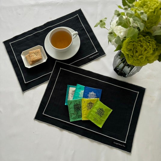 ジョージスチュアートティのロゴ入り。生地先端をパールグレーのメロウステッチで仕上げ、グラファイトブラックのカラーが上品なティーマットは、デイリーでも来客時のおもてなしでも、あらゆるシーンにマッチします。二層生地(生地を2枚合わせて縫製)のため丈夫で、耐久性も抜群です。さらに、手工芸的な奥ゆかしい風合いがあり、洋食器とも和食器とも相性◎。シックな食卓を演出します。少し小さめのサイズで、折りたためばコースターにもなる優れものです。日本製です。