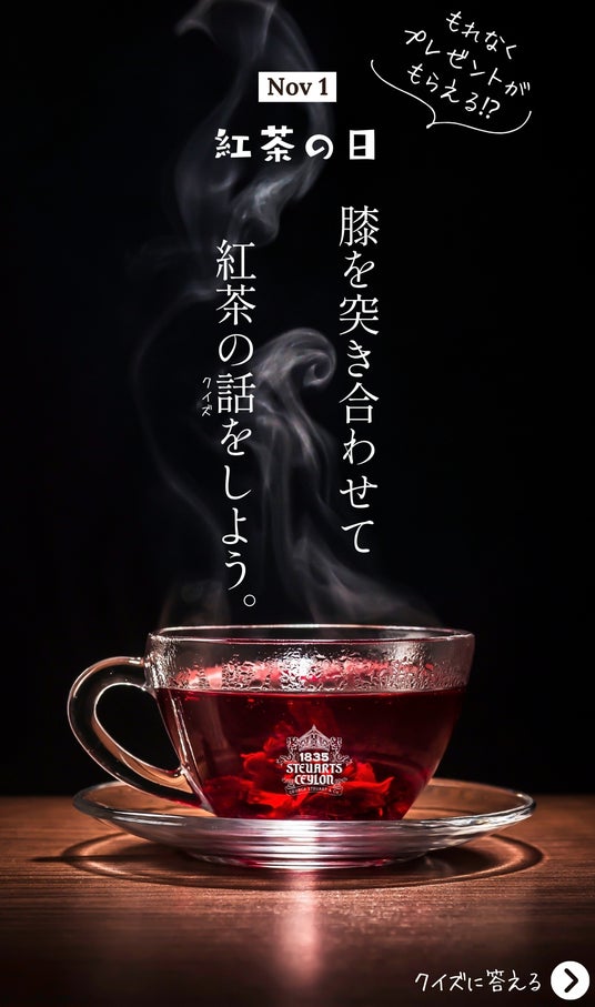 スリランカの老舗紅茶ブランド【George Steuart Tea(ジョージスチュアートティ)】(販売:株式会社味とサイエンス)は、11月1日の「紅茶の日」にお得なキャンペーンを開催いたします。その名も、「膝を突き合わせて紅茶の話(クイズ)をしよう!」キャンペーン。身体がじんわり温まる、紅茶が美味しい季節がやってきました。公式LINEにアップされる5つのクイズに答えて、公式オンラインショップでお買い物していただいた方に、素敵なプレゼントをお届けいたします。